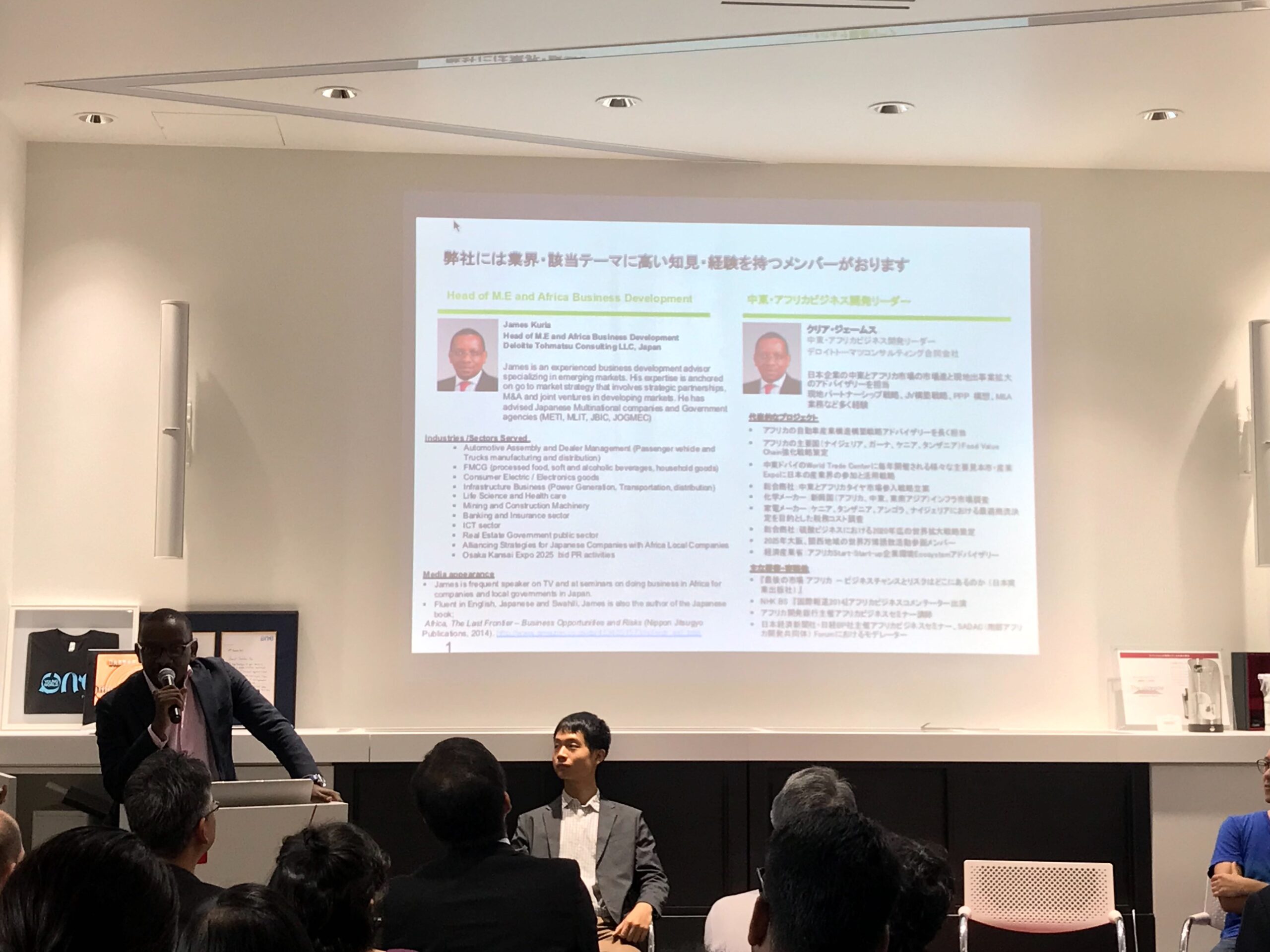 - Our second speaker was James Kuria, an industry leader who promotes cross-border business development for Japanese companies.The Head of M.E and Africa Business Developmentfor Deloitte Tohmatsu Consulting Japan, James is an experienced business development advisor specializing in emerging markets. His expertise is anchored on go to market strategy that involves strategic partnerships, M&A and joint ventures in developing markets. He has advised Japanese Multinational companies and Government agencies (METI, MLIT, JBIC, JOGMEC).James is a frequent speaker on TV and at seminars on doing business in Africa for companies and local governments in Japan. Fluent in English, Japanese and Swahili, he is also the author of the Japanese book, "Africa, The Last Frontier – Business Opportunities and Risks".
