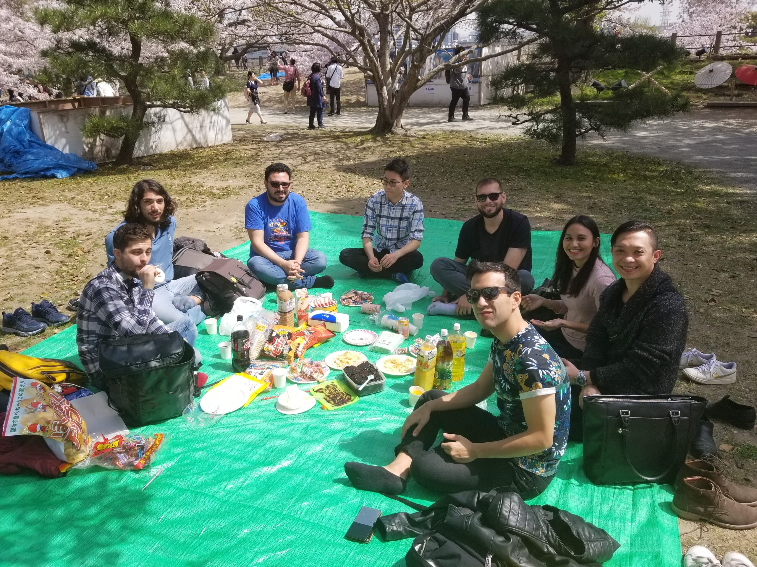 The Kyushu team organized a Hanami or cherry blossom viewing event on the 30th of March in Maizuru Park, Fukuoka. It was a perfect sunny day to enjoy the Sakura trees in full bloom. The event started at 10:30 am, but the numbers kept increasing till 2:00 pm. A hearty lunch followed, consisting of snacks and drinks, sponsored by both MSA and scholars participating in the event.