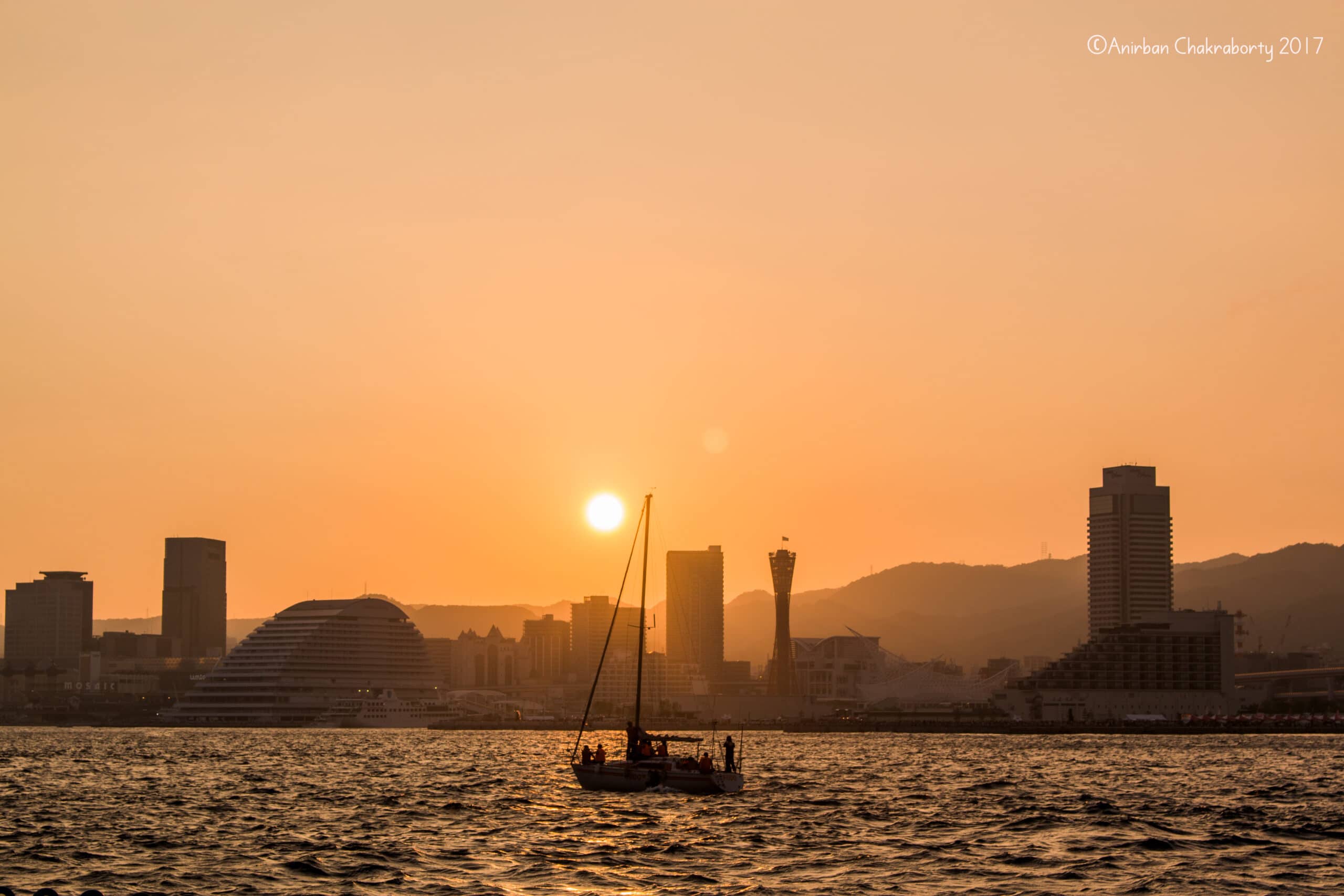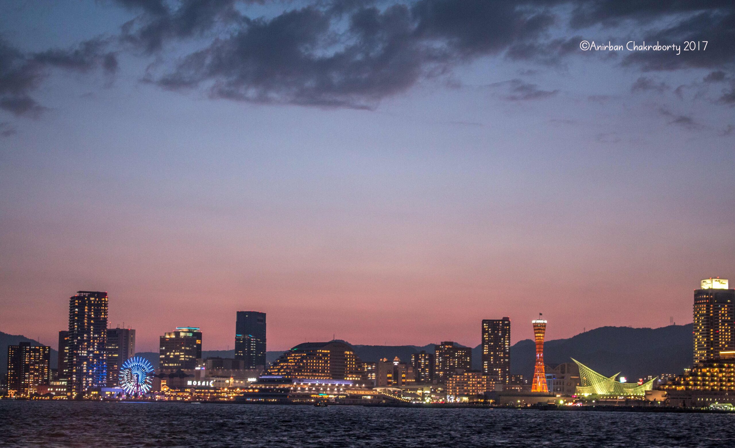 The Kobe Port area view is amazingly beautiful even without any fireworks. As wait continued, the group witnessed a beautiful sunset-show with the Port Tower area in the background. Then they were greeted by an amazing transition of the Kobe City-scape into a brilliantly lit nightscape. The view is considered one of the best in Japan.