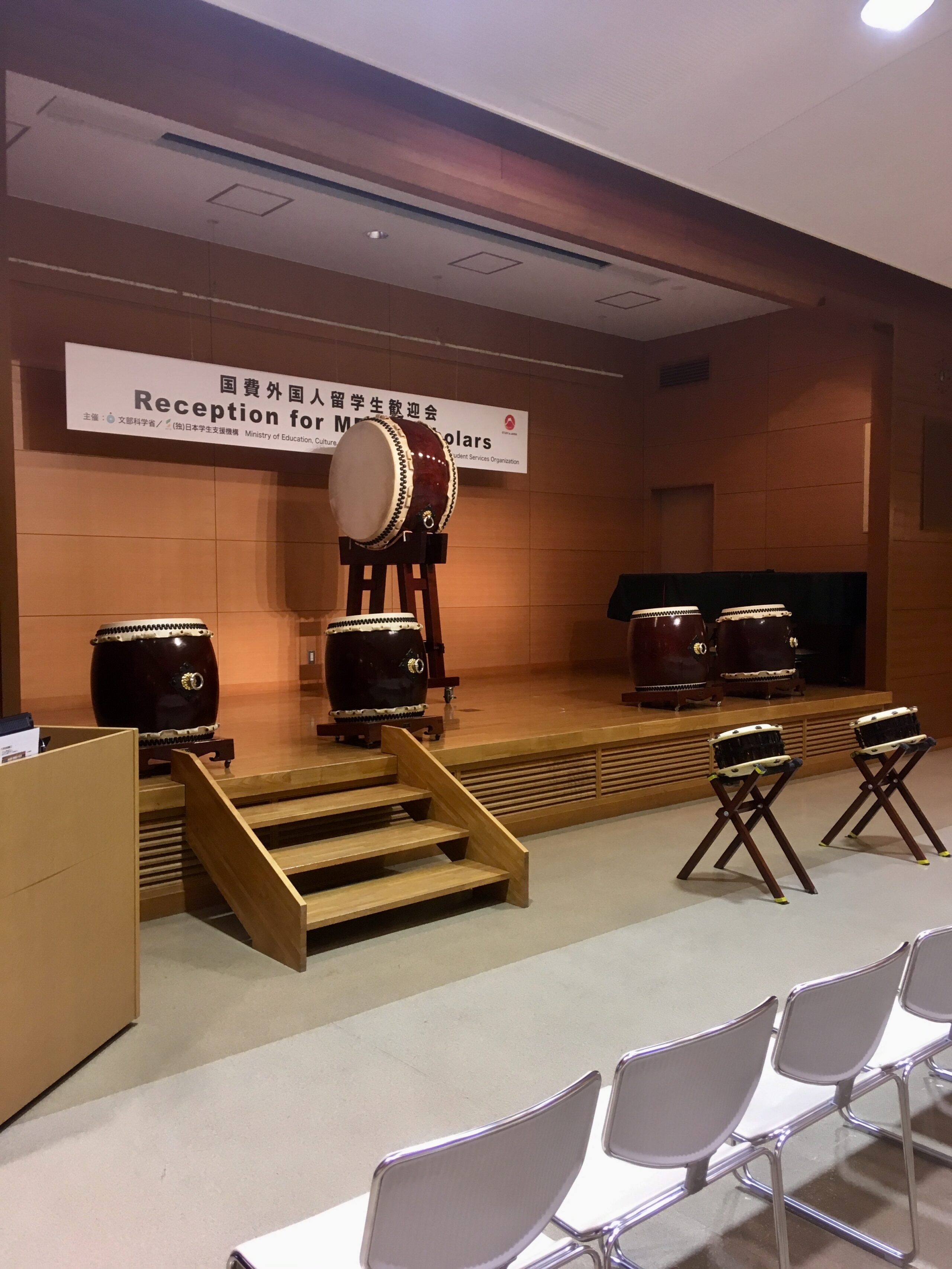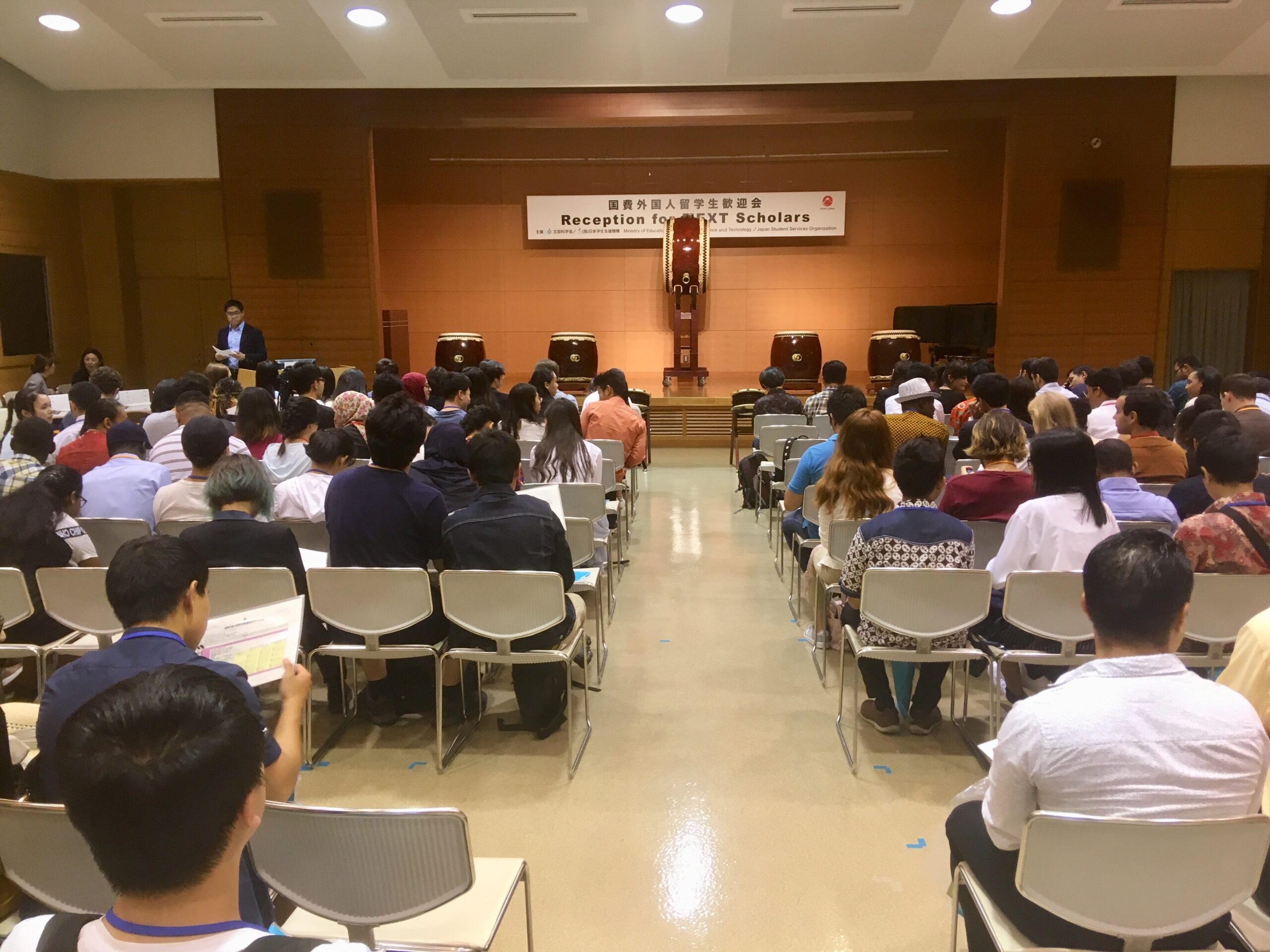 As soon as the explosive Wadaiko performance ended, the audience of newly-arrived MEXT Scholars was enthusiastically cheering for the skillful performance we all enjoyed! As the stage was being cleared and prepared, Austin and Harry invited the attending officials from MEXT and JASSO onto the stage. Mr. Kengo Iwamoto, Deputy Director-General, Higher Education Bureau, MEXT; Mr. Takaaki Oguri, Senior Specialist, Office of Student Exchange, Student Support and Exchange Division, MEXT; as well as Mr. Hideki Yonekawa, Vice President of JASSO; and Mr. Tomoya Yoshioka, President of JASSO, all gave a heartwarming welcome address to the new MEXT Scholars, wishing them to excel in their academic and professional careers but also prompting them to not forget to enjoy life in Japan, having fun while delving into the society and culture of this unique country.