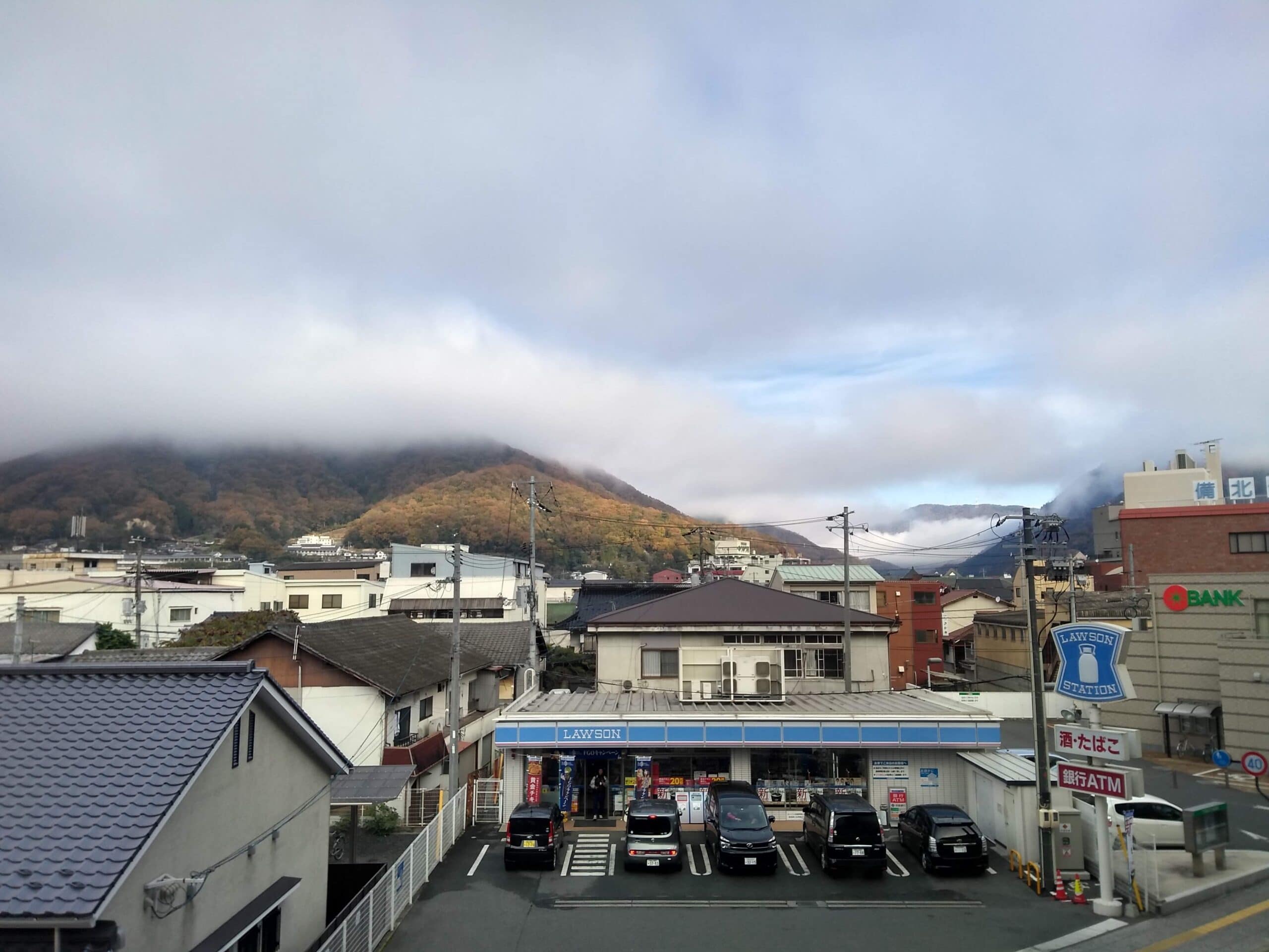Our trip started at Okayama station at 7:49 AM. It was a foggy cold morning and an hour-long train journey offered the view of beautiful landscapes through the windows. We could see clouds rising from far away mountains and it was beautiful. We reached Bitchutakahashi station around 8:49 AM and two things happened immediately as we got out of the platform. We felt freezing cold despite being covered from head to toe in winter outfits. We checked and found out that the temperature at that point was 0 degree celsius. And the second thing was the amazing view from the station balcony. We were a tad-bit late for the unkai or sea of clouds from the castle observatory but we were not to leave Takahashi without experiencing it. The clouds around the mountains of Bitchutakahashi station were beautiful and gave us all the right energy to embark on our journey to the castle.