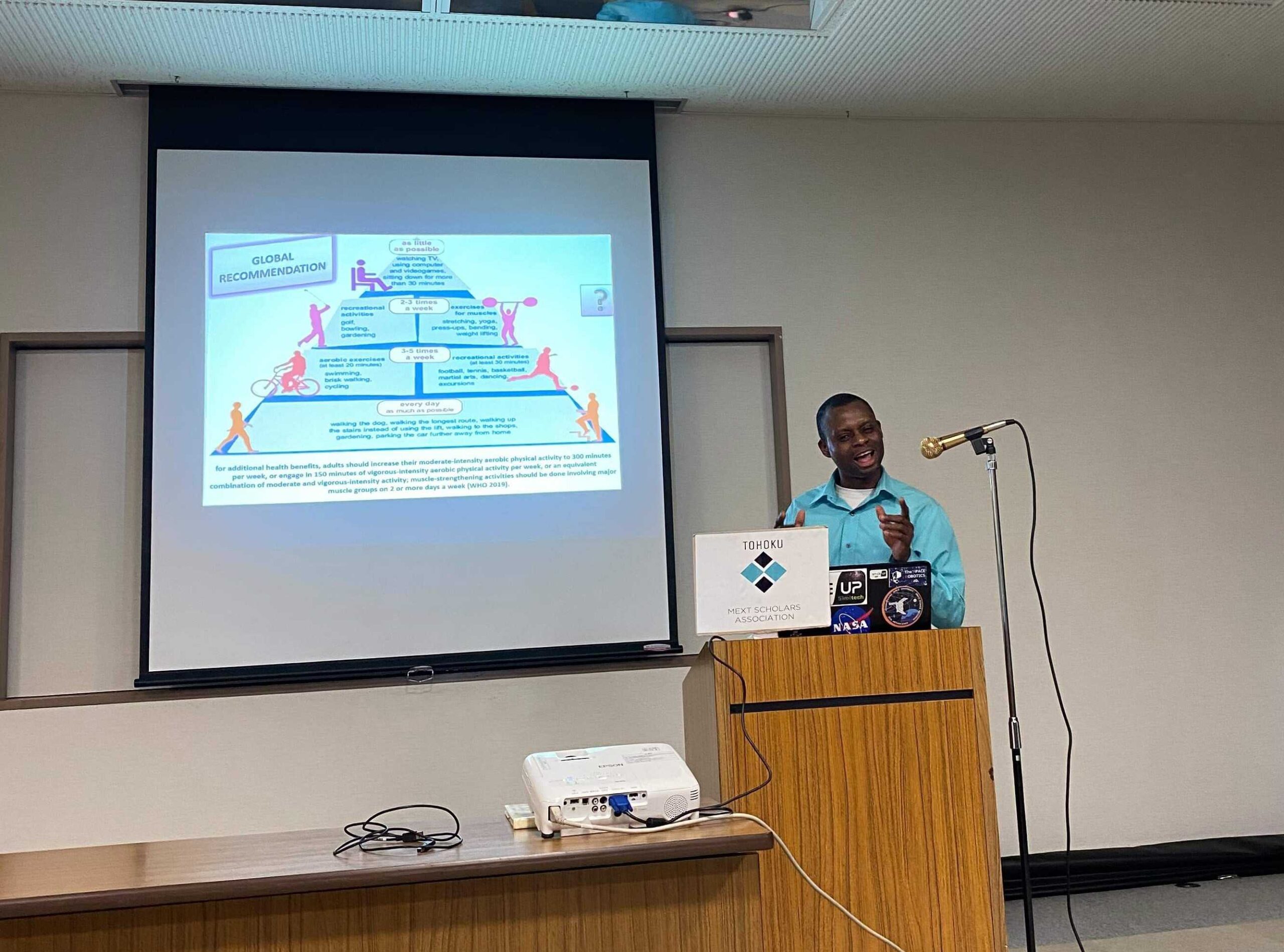 Adeoya Akindele from Miyagi University talked about how to reconcile academic life with sports in order to lead a healthy life. He identified the increasing decline in sports participation due to academic pressure, and the physical, psychological and social side-effects of a sedentary lifestyle. The talk led to a productive discussion of how international students are unable to engage in sports clubs and circles at Tohoku University as leisure activities due to unreal expectations of qualifying in regional and national challenges.