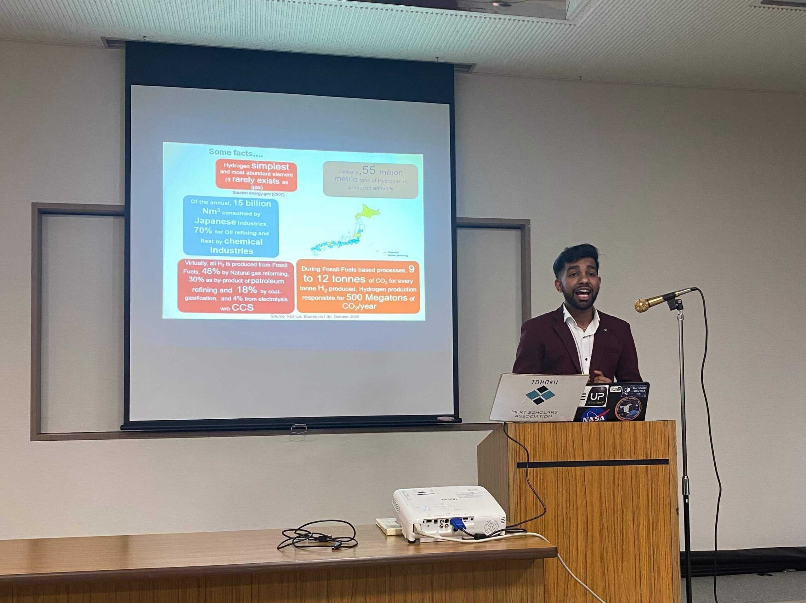 Aman Sharma, 2nd Year Masters student in Environmental Studies presented about his research on Hydrogen fuel cells. He emphasized how this clean energy source will soon revolutionize the energy industry and automobile sector especially in Japan. He also outlined the challenges ahead in this field and possibilities to overcome those, and how hydrogen will play a significant role in connecting various sectors of the economy.